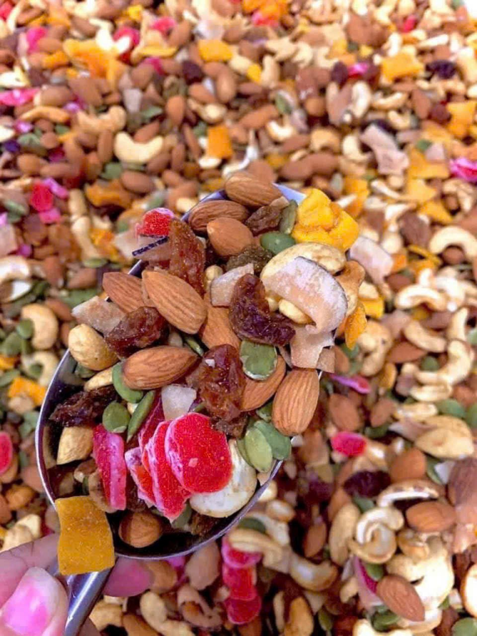 Nguyên liệu: hạt hạnh nhân, hạt điều, hạt bí, trái cây sấy.