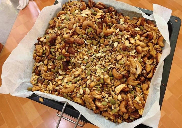 Trộn với mật ong và dầu dừa, nướng nhẹ 5 phút.