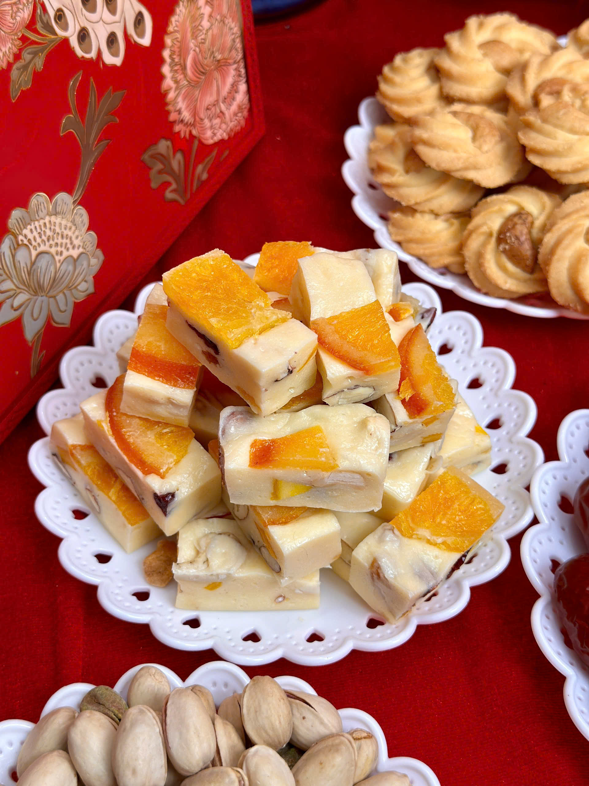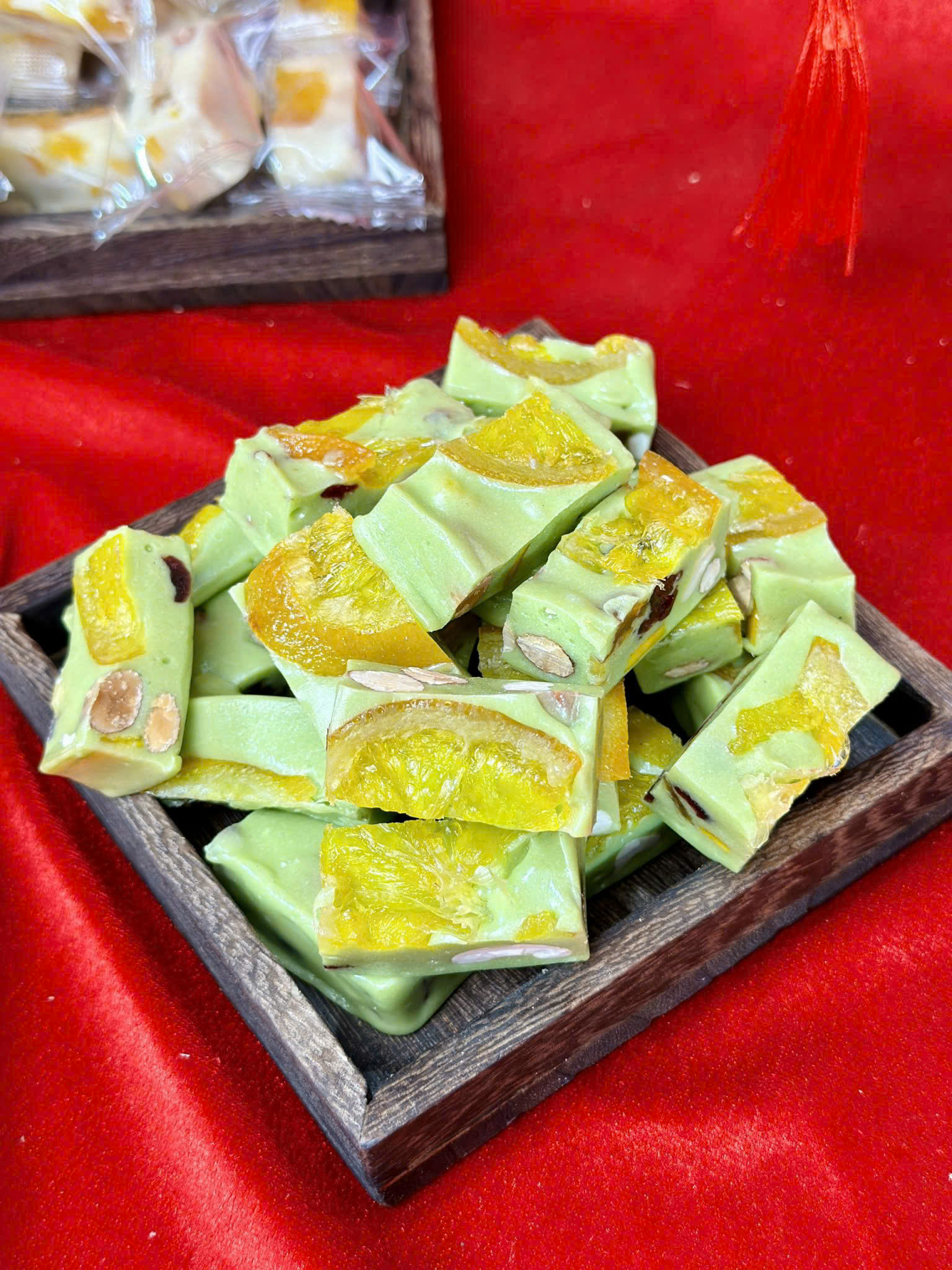 Kẹo Nougat Sữa Cam Vàng lại thiên về vị béo nhẹ, mềm dẻo, ngọt vừa phải. Cam vàng giúp cân bằng vị sữa, tạo cảm giác dễ chịu khi nhâm nhi cùng trà nóng trong những ngày Tết se lạnh.