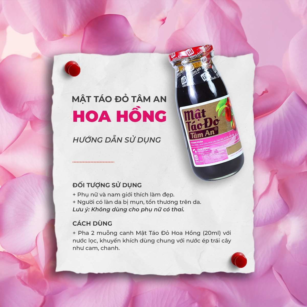 Những công dụng này khiến Mật Táo Đỏ Tâm An Hoa Hồng trở thành lựa chọn lý tưởng cho những ai muốn kết hợp làm đẹp và chăm sóc sức khỏe toàn diện.