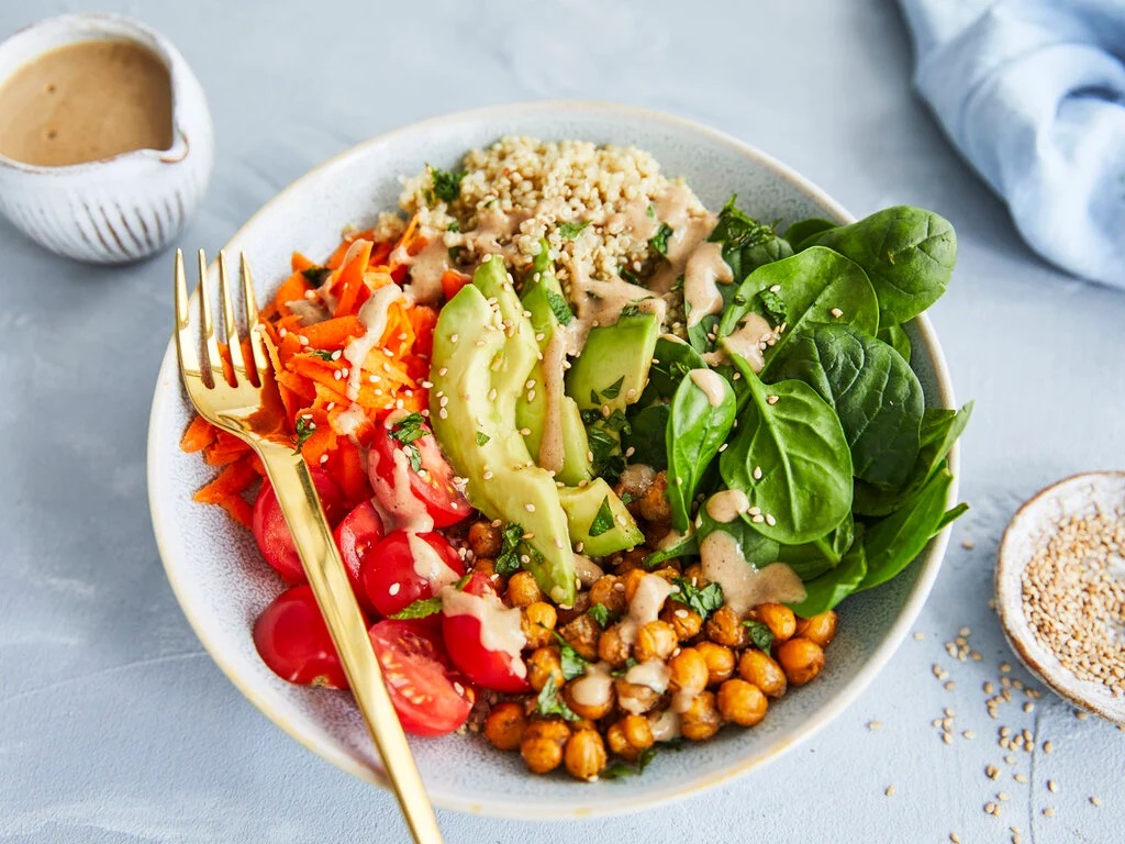 Salad ngũ cốc với quinoa, rau xanh và hạt chia là một lựa chọn tuyệt vời cho bữa trưa. Món ăn này cung cấp đầy đủ protein và chất xơ, giúp bạn cảm thấy no lâu hơn mà không lo tăng cân.