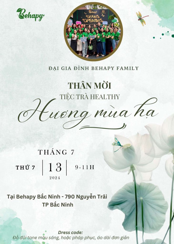 Buổi Tiệc trà healthy Hương mùa hạ tại Behapy Bắc Ninh là dịp tuyệt vời để chúng ta cùng nhau khám phá, học hỏi và tạo dựng những mối quan hệ gắn kết. Behapy rất hy vọng được đón tiếp Quý vị tại sự kiện này, để cùng nhau tận hưởng những giây phút vui vẻ, ý nghĩa và bổ ích.