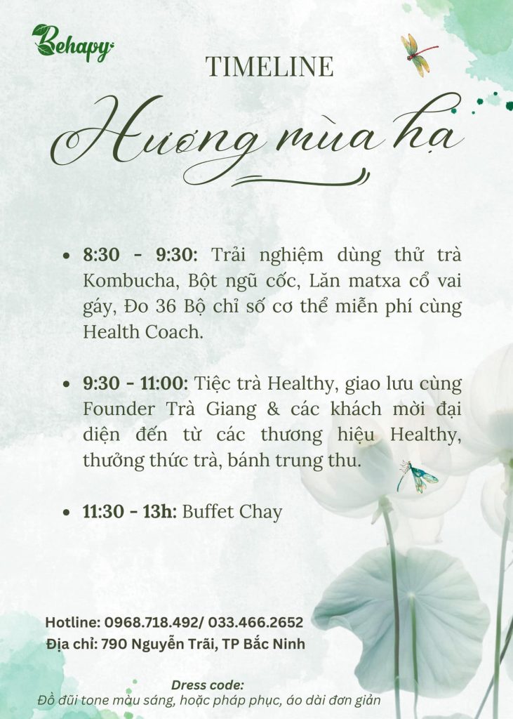 Behapy xin trân trọng kính mời Quý vị đến tham dự buổi Tiệc trà healthy Hương mùa hạ, một sự kiện đặc biệt nhằm tri ân và gắn kết cộng đồng Behapy. Đây không chỉ là một dịp để chúng ta gặp gỡ, chia sẻ mà còn là cơ hội để tận hưởng những giây phút thư giãn, bổ ích trong không gian ấm cúng và thân thiện.