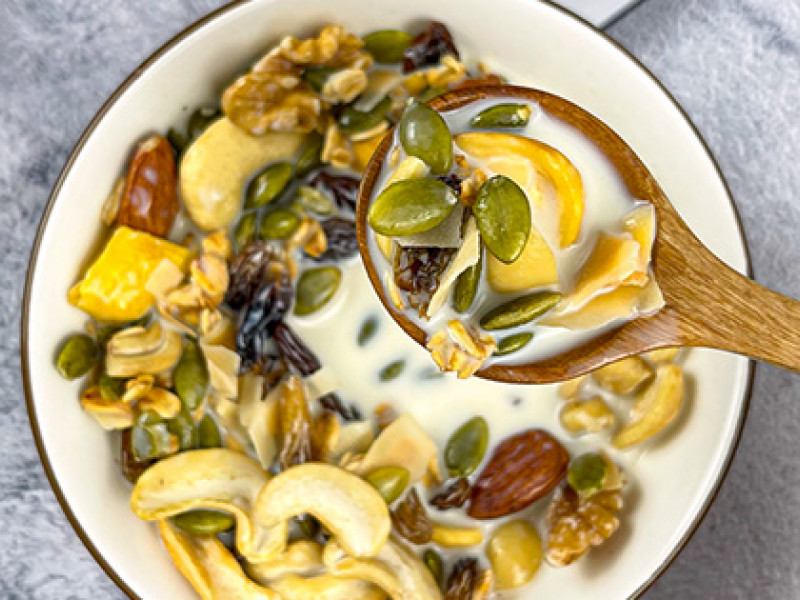 Yến mạch ngâm sữa hạt, topping hạt điều hoặc trái cây tươi.