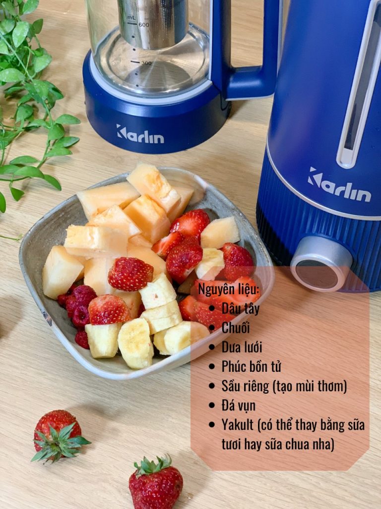 Chuẩn bị: Dâu tây, chuối, dưa lưới, phúc bồn tử, sầu riêng, đá vụn, sữa chua uống Yakult