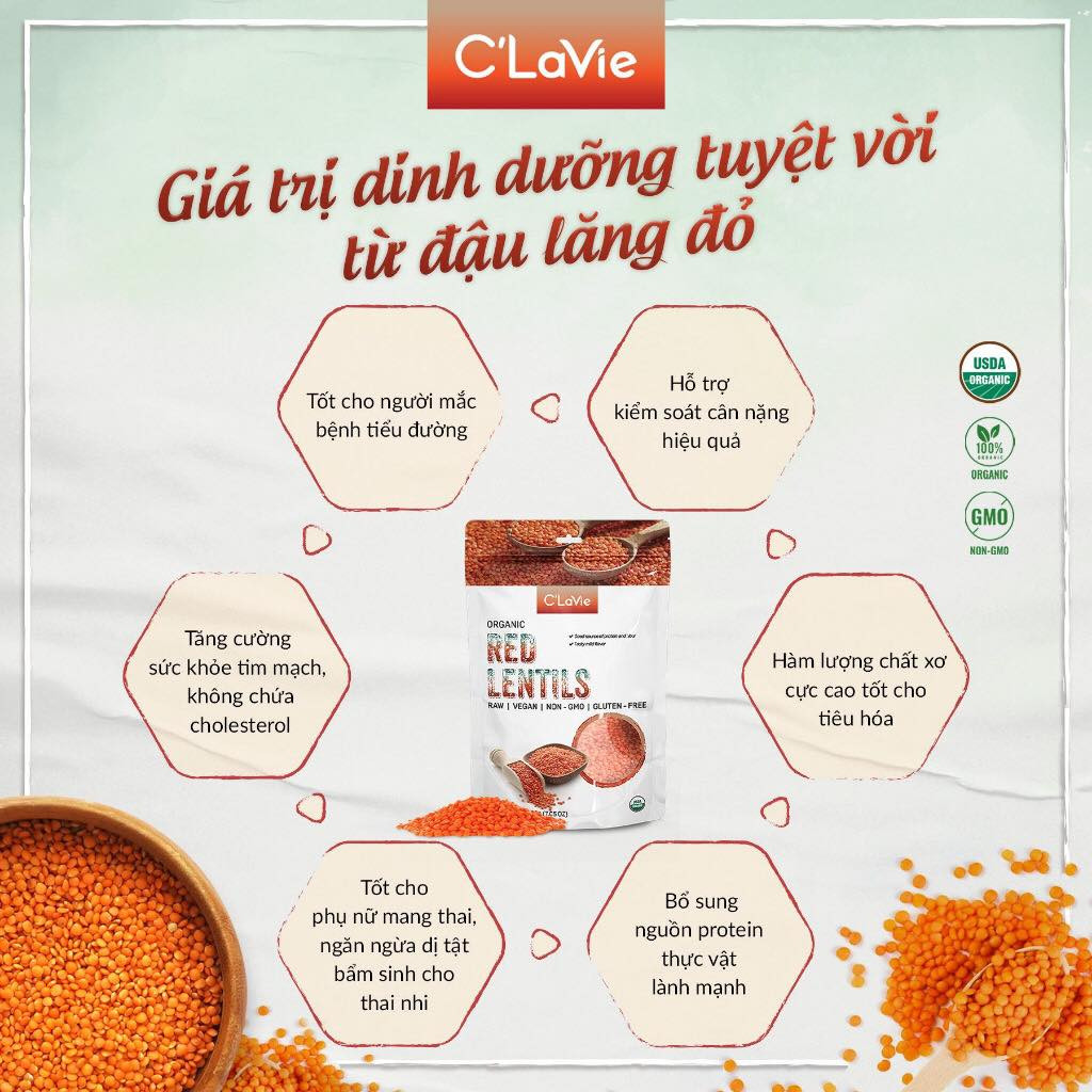 Sản phẩm đậu lăng đỏ hữu cơ C’Lavie 200g đạt chuẩn chất lượng Mỹ và đóng gói dạng túi zip vô cùng tiện dụng. Đây là một lựa chọn tuyệt vời cho những người đang tìm kiếm sản phẩm hữu cơ và dinh dưỡng trong chế độ ăn uống của mình. Hãy thử sử dụng loại hạt siêu dinh dưỡng này và trải nghiệm những lợi ích sức khỏe tuyệt vời mà nó mang lại.