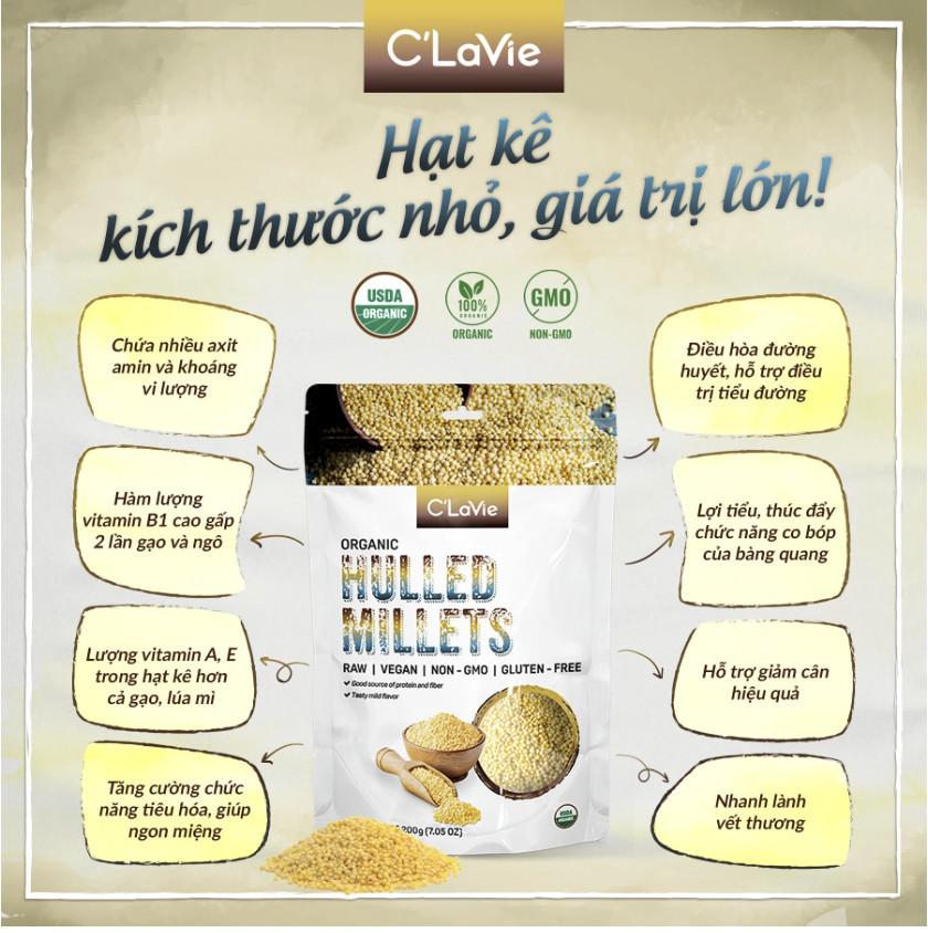 Hạt kê hữu cơ C’Lavie không chứa gluten, phù hợp với những người dị ứng hoặc không dung nạp gluten. Loại ngũ cốc này cũng chứa nhiều chất khoáng và vitamin tốt cho sức khỏe, giúp tăng cường sức khỏe hệ tiêu hoá, giảm cholesterol, ngăn ngừa lão hoá, ngăn ngừa bệnh tiểu đường và bổ sung năng lượng cho cơ thể.