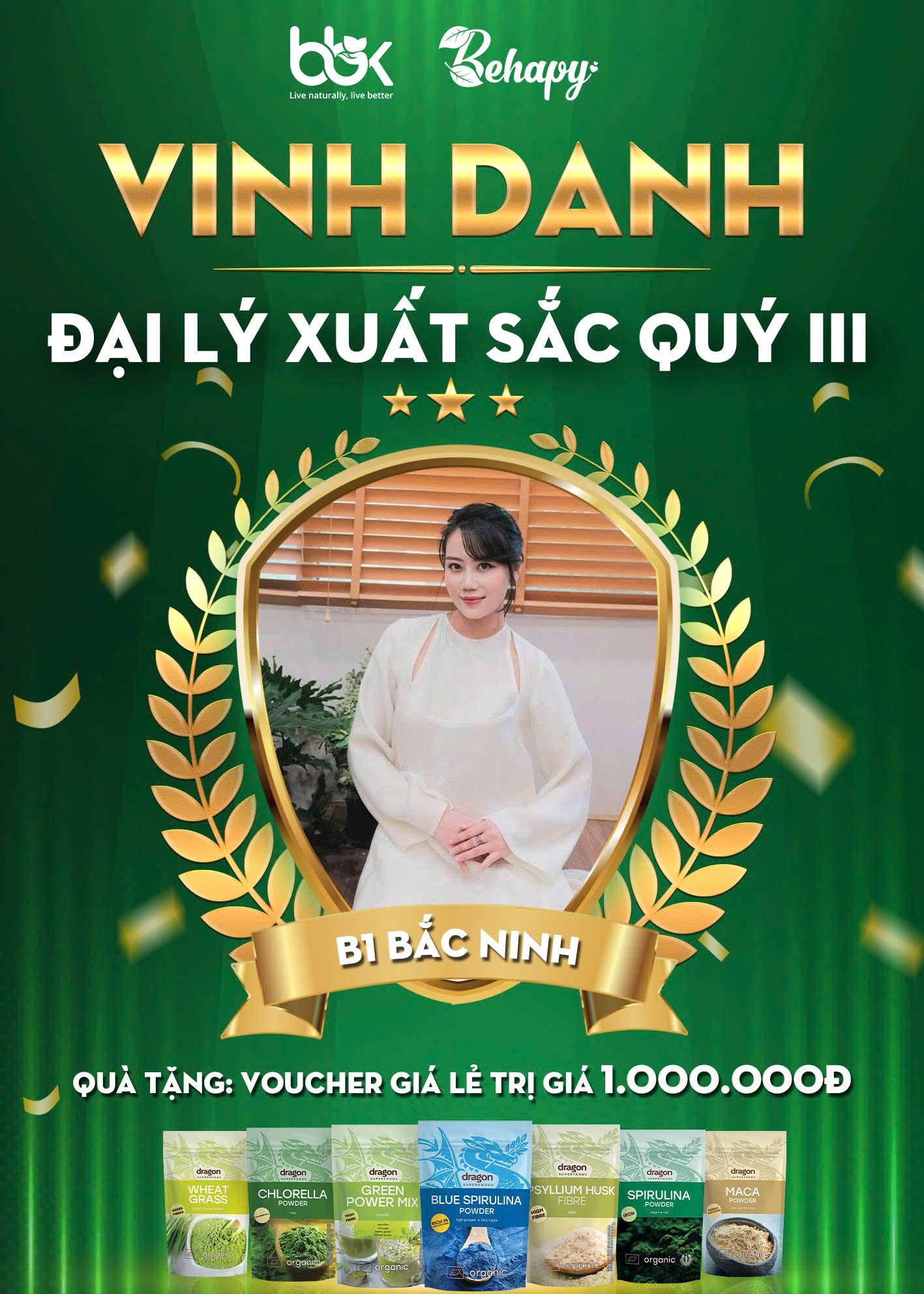 BB&K và Behapy xin gửi tặng voucher giá lẻ trị giá 1.000.000 đồng như lời cảm ơn chân thành cho những nỗ lực không ngừng nghỉ của đại lý Bắc Ninh. Thành công của đại lý chính là minh chứng rõ nét cho triết lý “Kinh doanh hạnh phúc – Lan tỏa điều tốt lành” mà hệ thống đang hướng đến.