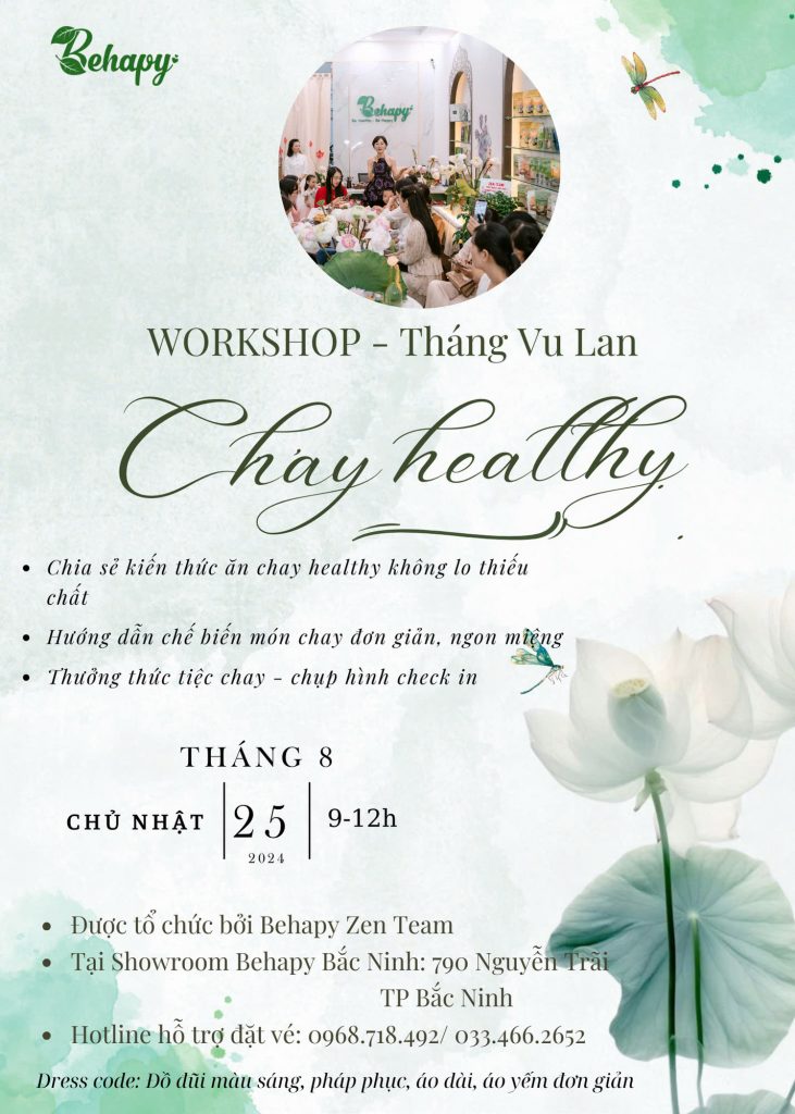 Vu Lan, mùa báo hiếu, là thời điểm để mỗi người chúng ta tạm dừng nhịp sống hối hả, hướng lòng mình về những người thân yêu, tri ân và chăm sóc cả thể chất lẫn tinh thần. Để đồng hành cùng các bạn trong hành trình này, Behapy tổ chức Workshop “Chay Healthy Màu Vu Lan” vào ngày Chủ Nhật, 25/8/2024, từ 9h00 đến 12h00, tại Showroom Behapy Bắc Ninh – 790 Nguyễn Trãi, TP. Bắc Ninh. Đây là một sự kiện đặc biệt do Behapy Zen Team tổ chức, nhằm lan tỏa tình yêu thương và khuyến khích lối sống lành mạnh, bền vững.